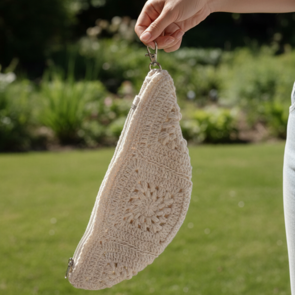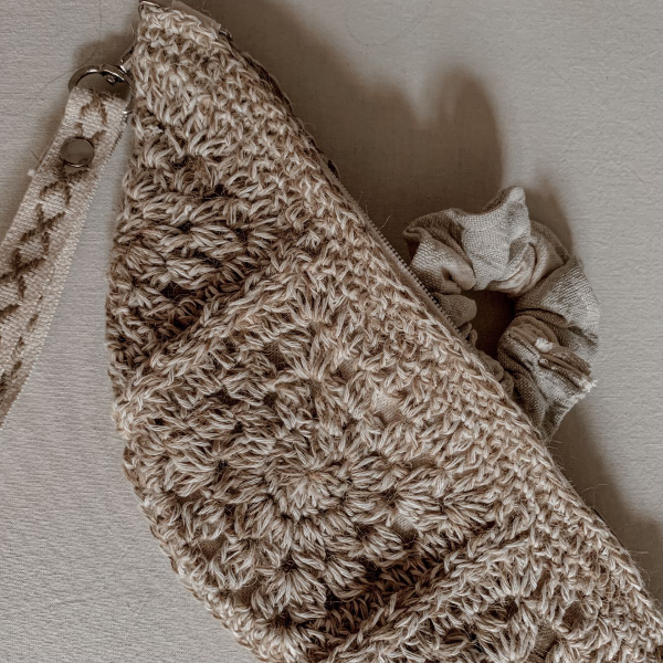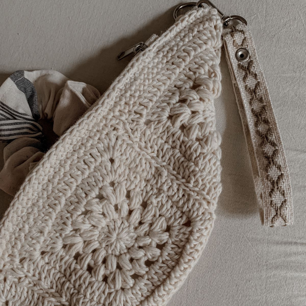 Sobre tejido al crochet de yute y algodón forrado en su interior, con cierre.