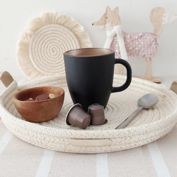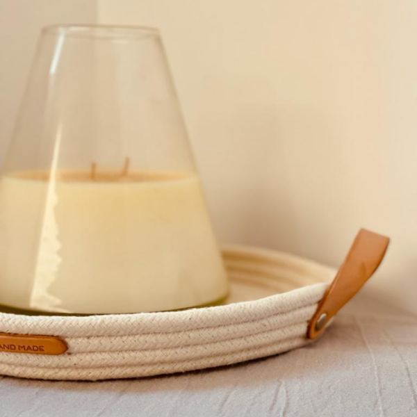 Hecho a mano con soga de algodón color crudo y manijas de cuero.