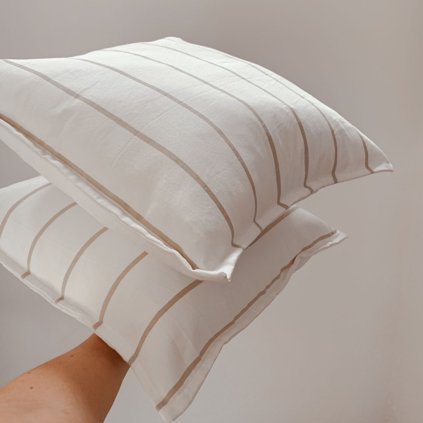 Almohadones en género Tusor pesado con rayas tejidas, terminación pespunte.