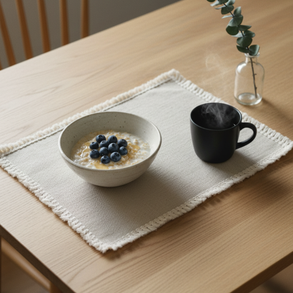 Individual de tela de PVC con base de felpa, imita al lino y al yute. Con flecos de algodón en sus puntas.